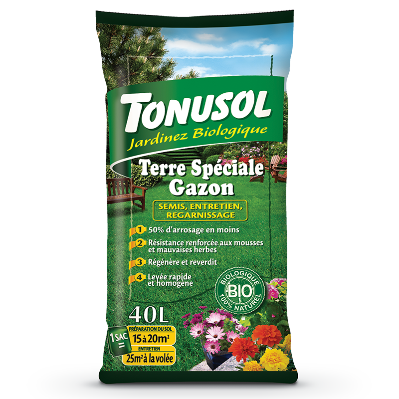 Composition : tourbe blonde, écorces de pin compostées, fumier de cheval, sable de rivière, algues marines, engrais organique naturel, lombric compost