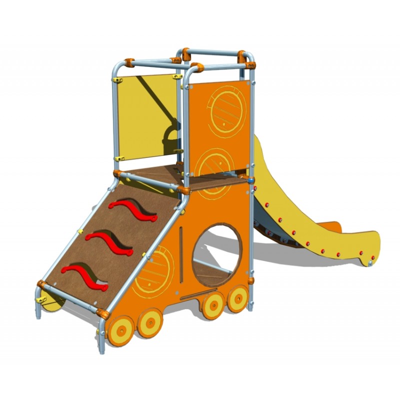 De configuration compacte, cette aire de jeux permet aux enfants de s'amuser en sécurité.