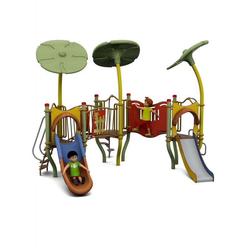 De configuration compacte, cette aire de jeux permet aux enfants de s'amuser en sécurité.