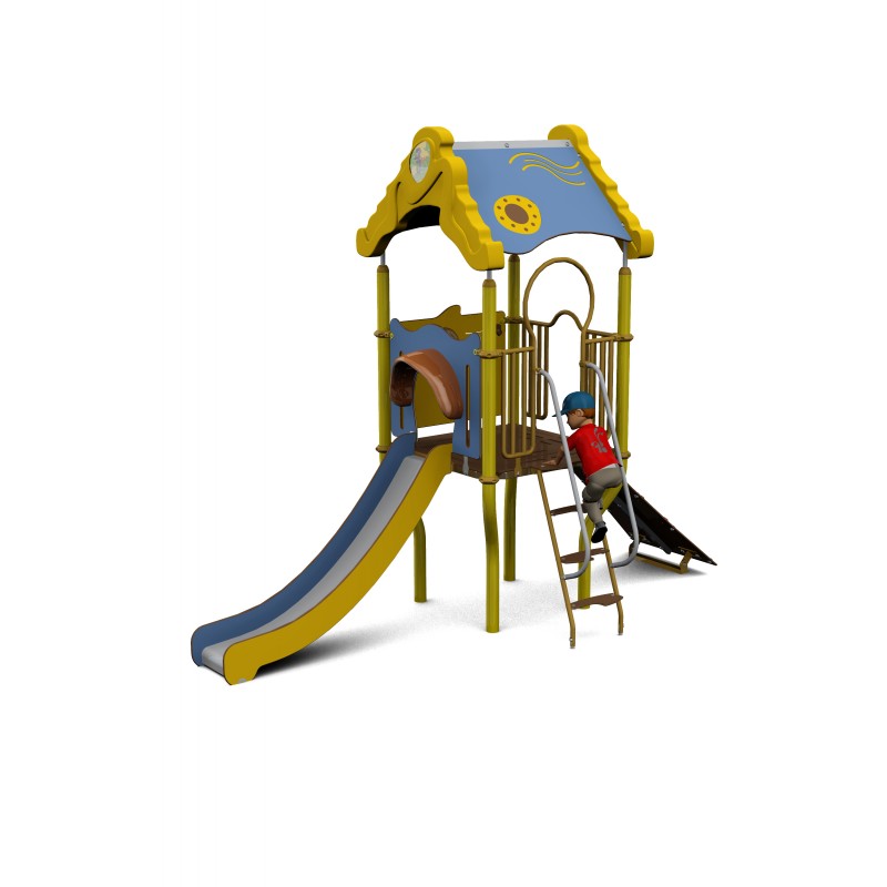 De configuration compacte, cette aire de jeux permet aux enfants de s'amuser en sécurité.