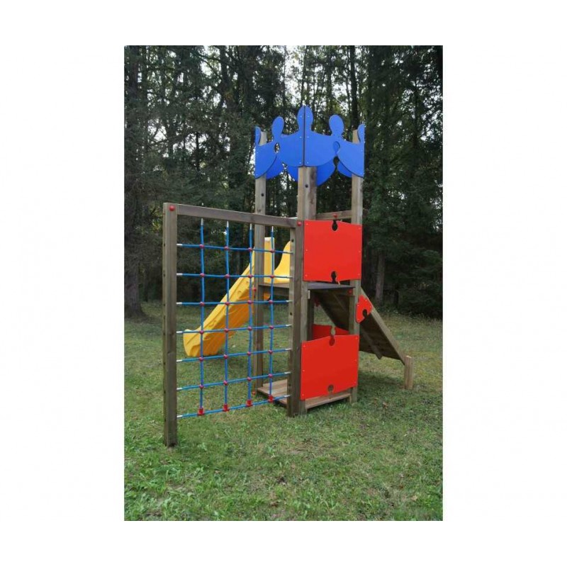1 tour carrée avec créneaux, 1 toboggan, 1 plan incliné, et 1 filet vertical