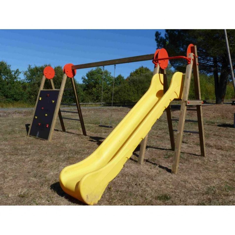 Composition : 1 balançoire (+chaîne inox + antivrille + 2 crochets d'agrès); 1 mur d'escalade, 1 plateforme de départ; 1 toboggan; 6 joues de renfort, 8 poteaux de 90x90 en contre collé , 1 poutre en lamellé collé 132x90 longueur 4930 mm